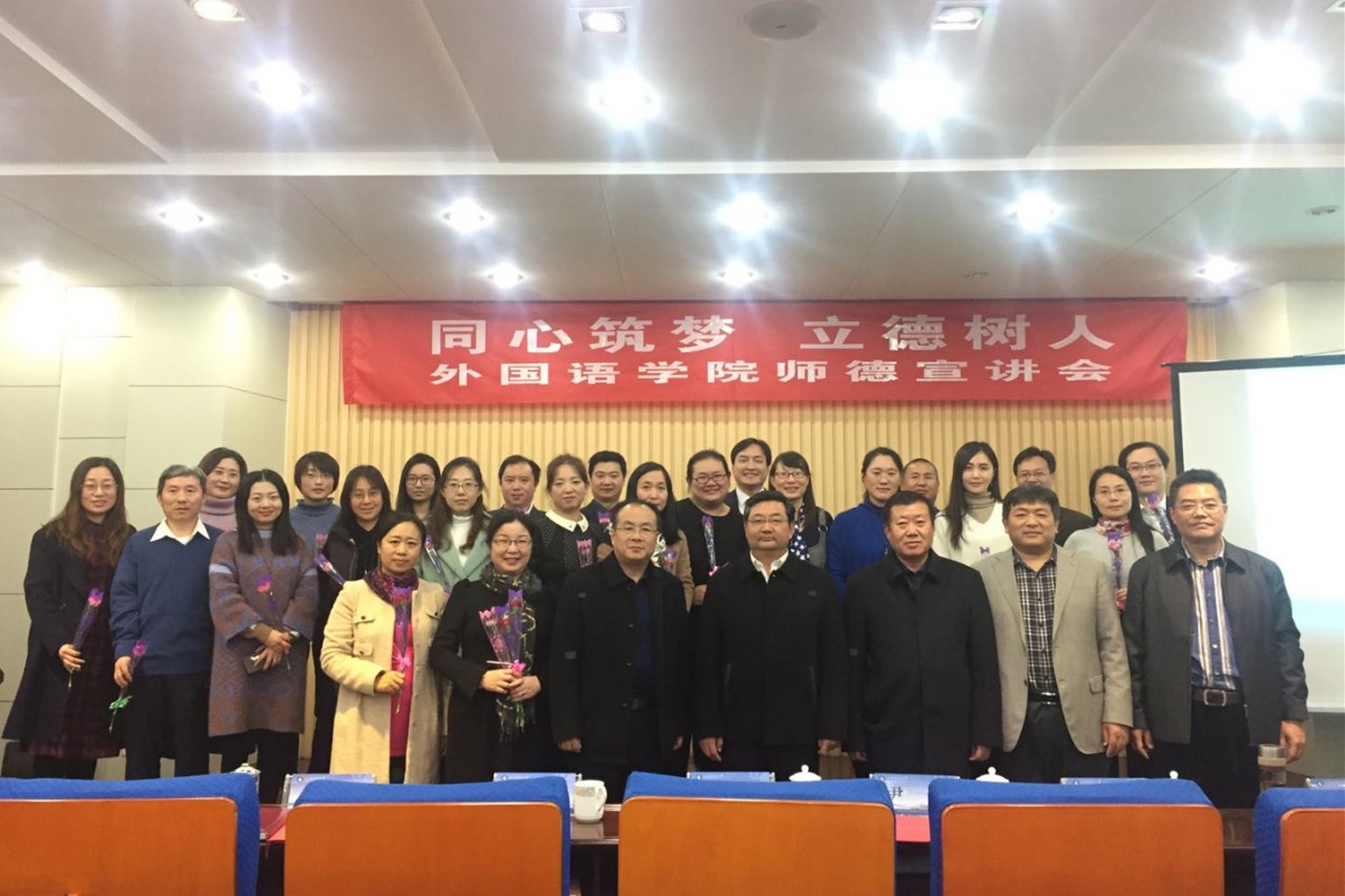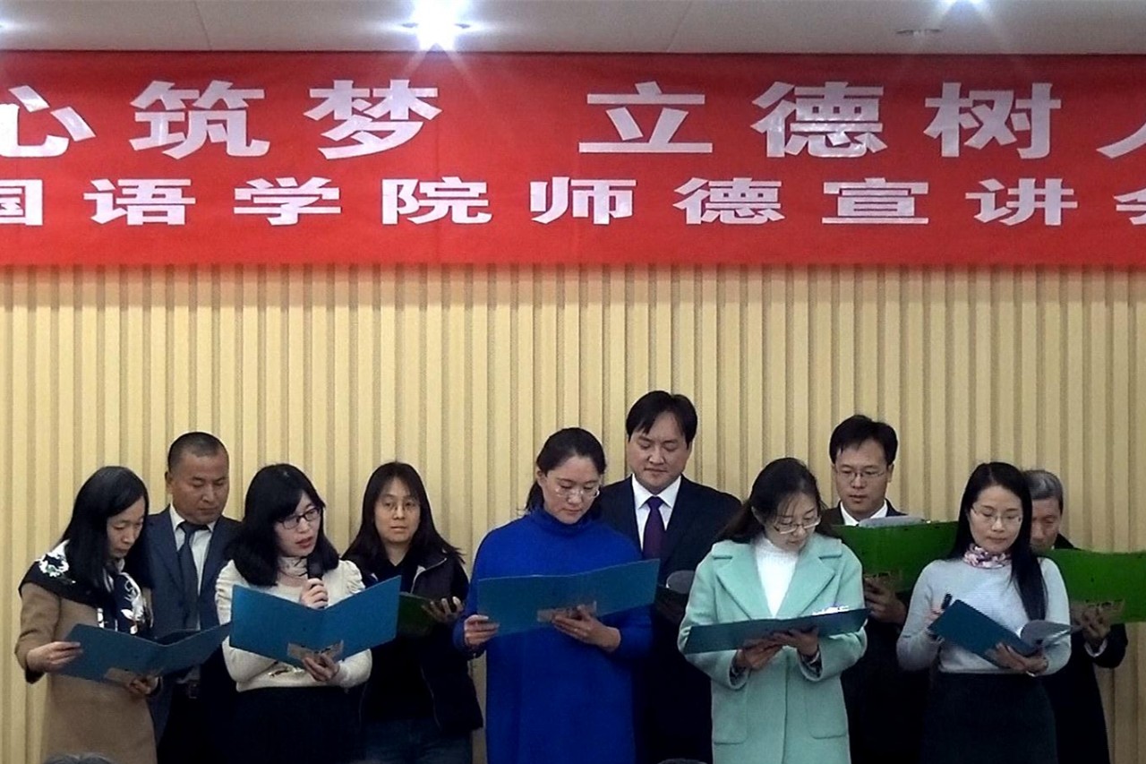 宣讲会上,学院八个单位的教职工以朗诵、演讲、快板、音乐故事等多种形式,生动地展示了发生在自己身边教工身上“一支粉笔写春秋,三尺讲坛育桃李”的感人事迹。大学英语第二教研室全体老师的诗歌朗诵《你 我 我们》歌颂了敬业爱生、严谨治学的师德风范;房红芳老师讲述了学术英语教研室在教学、科研及各项活动中做出的不凡成绩;侯晓媛老师用欢快幽默的快板《小身体 大能量》展现了学院机关管理服务工作的热情、细致、周到、高效的点点滴滴;日语系马力老师道出了师者无悔无私奉献的真理;徐慧老师的《我斜对桌的大姐》讲述了中外文化教研室崔倩老师几十年如一日,舍小家为大家、甘于奉献、潜心育人的感人故事;王文老师以小见大,回顾了翻译系教师勤于探索、默默奉献、甘为人梯的感人事迹;英语系别俊玲老师的《静待花开》讲述了英语系庞燕宁博士在承担了繁重教学任务和家庭重担的同时,勤于治学,获批学院第一个国家社会科学基金项目的先进事迹;大学英语第一教研室全体老师以音乐故事的新颖形式,唱出了他们对师德的感悟……