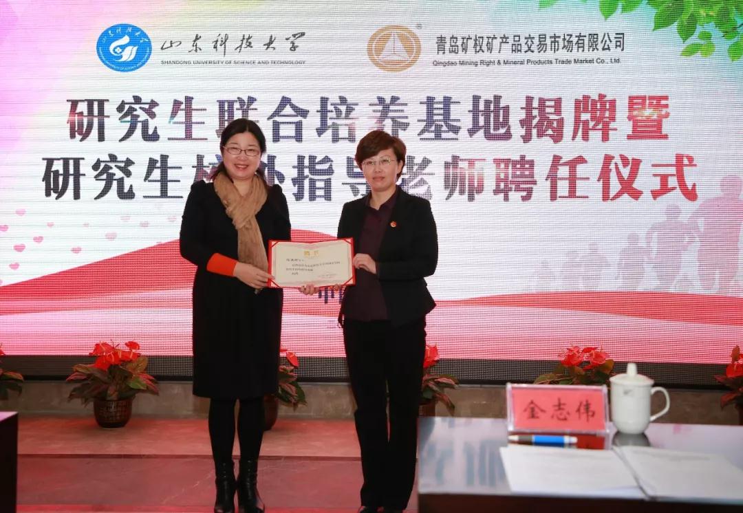 仪式上,副校长曾庆良、青岛矿权矿产品交易市场有限公司总裁金志伟共同为研究生联合培养基地揭牌。菲律宾亚星院长唐建敏代表学院分别为青岛西海岸新区团委书记冯洪珍、青岛万嘉集运物流有限公司董事长吴绍勇、青岛矿权矿产品交易市场总裁金志伟颁发研究生校外指导老师聘书。