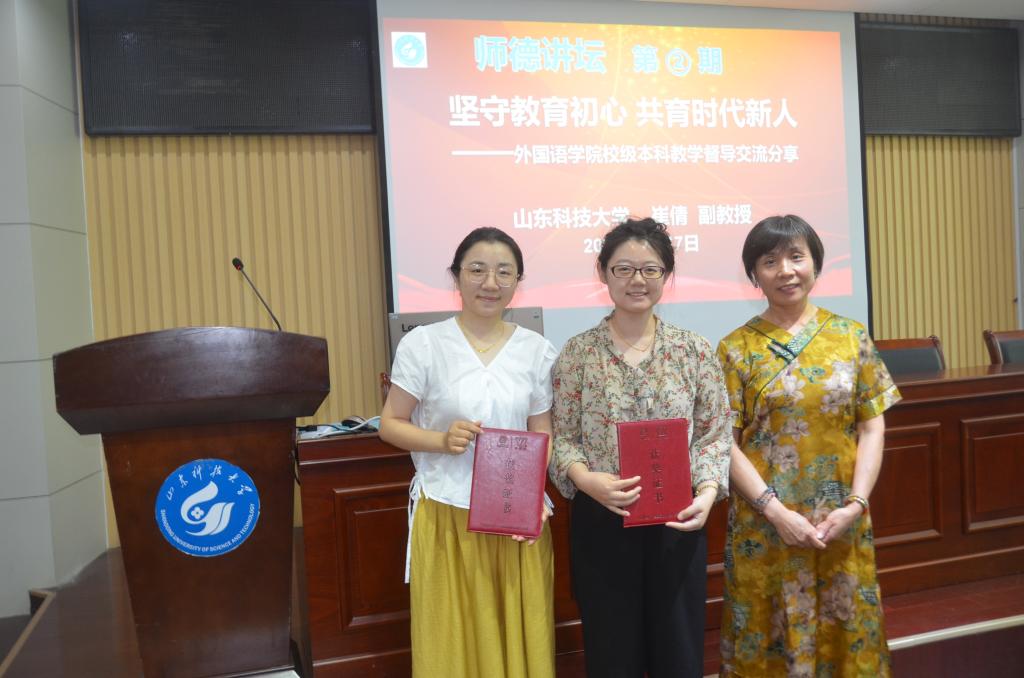 会上,学院为在第16届“外教社杯”全国高校外语教学大赛山东赛区决赛中获奖的团队举行了现场颁奖仪式。其中,迟雯雯团队荣获一等奖,李轶欧团队获得三等奖。