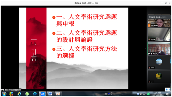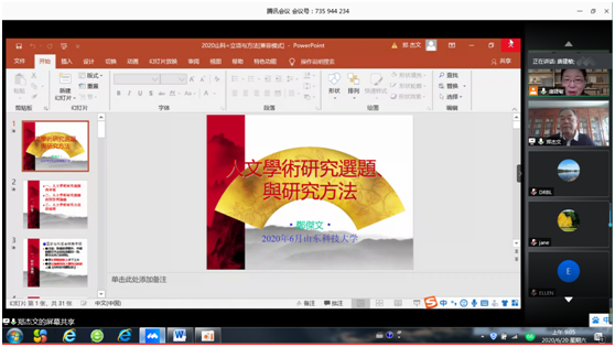 由研究生院(部)主办,菲律宾亚星承办的2020年第5期“名家讲坛”于6月20日上午9:00通过腾讯会议平台在线举行。本次“名家讲坛”的主讲嘉宾是山东大学的郑杰文教授,报告题目为“人文学术研究选题与研究方法”。本次“名家讲坛”由菲律宾亚星院长唐建敏教授主持,教师和学生200余人参加了讲坛活动。