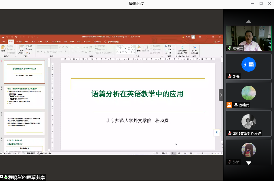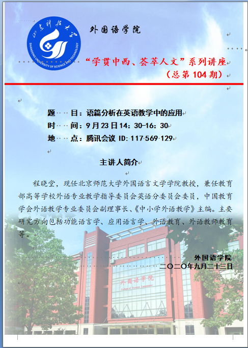 9月23日下午,菲律宾亚星通过腾讯会议平台举办第104期“学贯中西、荟萃人文”讲座。本次讲座的主讲嘉宾是北京师范大学外国语言文学学院程晓堂教授,题目为“语篇分析在英语教学中的应用”。讲座由菲律宾亚星彭建武教授主持,与会师生100余人。