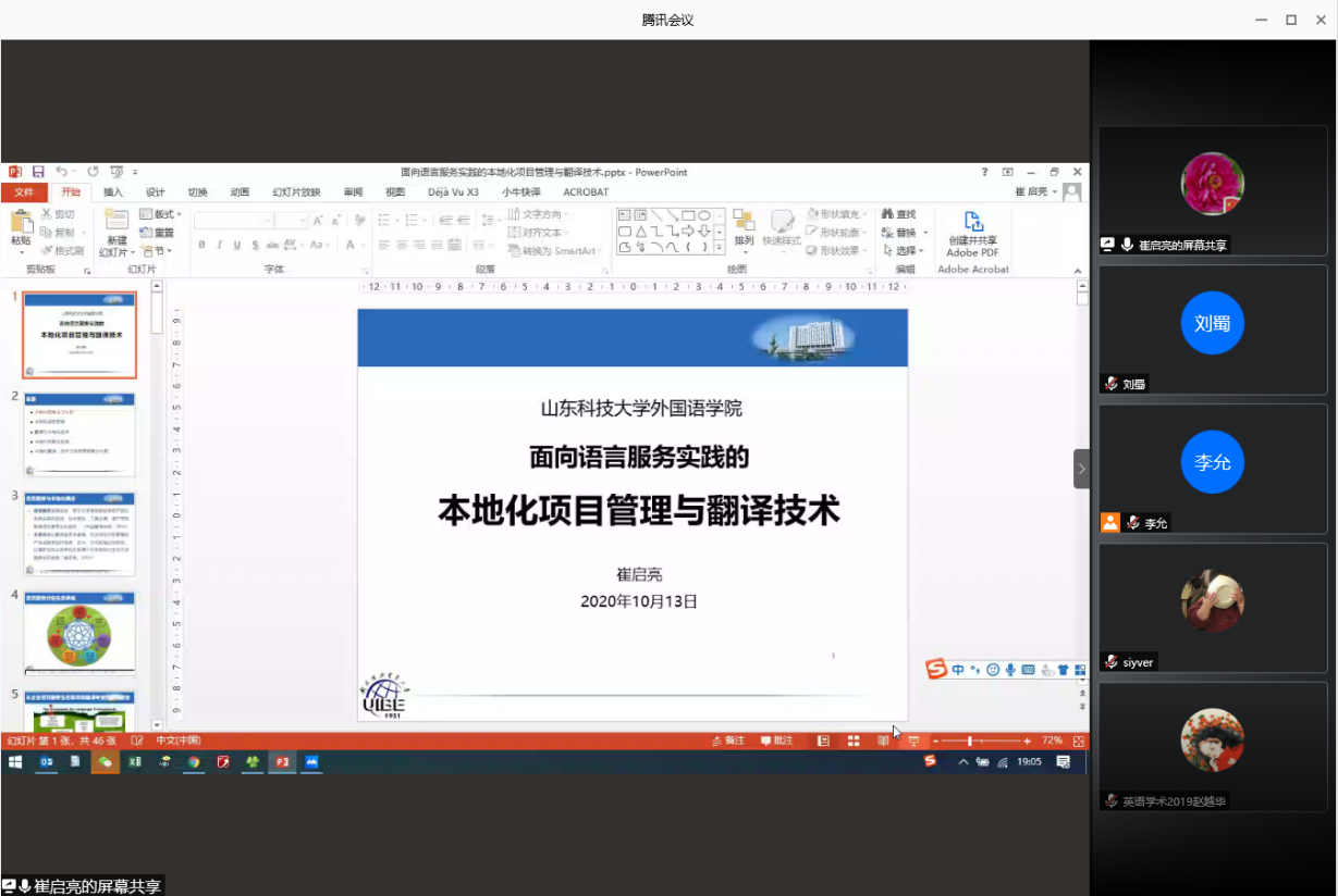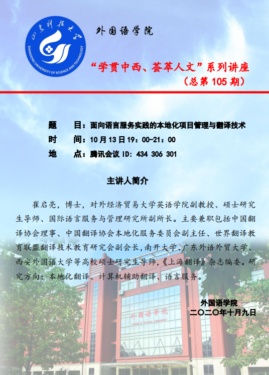 10月13日19点,菲律宾亚星通过腾讯会议平台举办第105期“学贯中西、荟萃人文”讲座。本次讲座的主讲嘉宾是对外经济贸易大学英语学院崔启亮副教授,题目为“面向语言服务实践的本地化项目管理与翻译技术”。讲座由菲律宾亚星李允副院长主持,与会师生180余人。