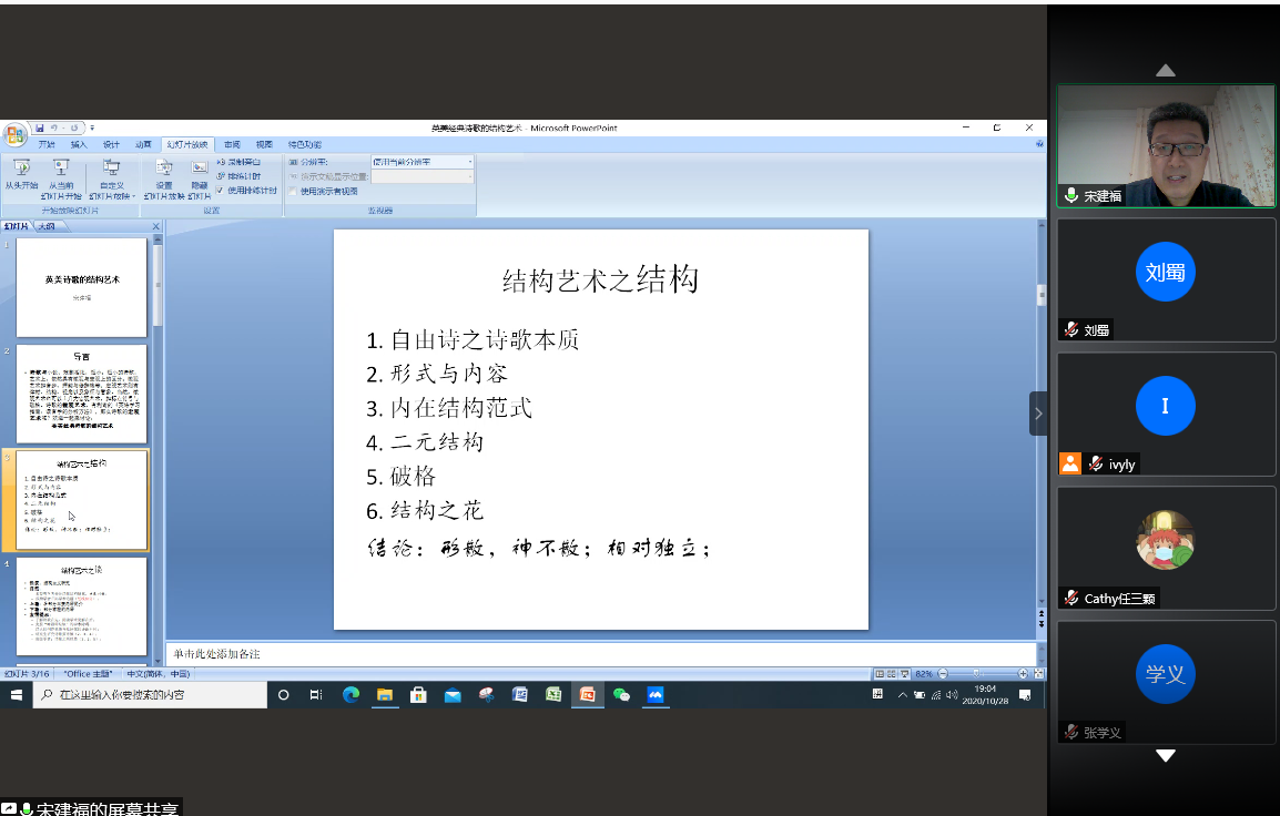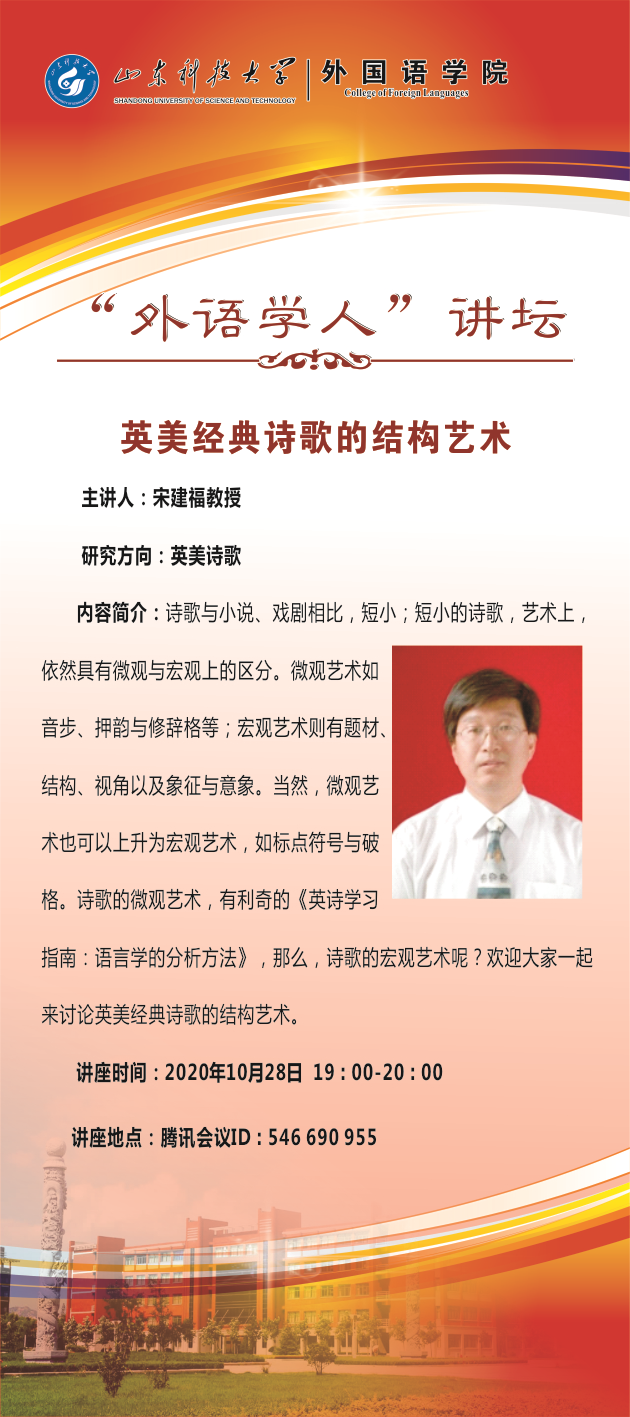 10月28日19:00点,菲律宾亚星通过腾讯会议平台举办第二十期“外语学人”讲坛活动。菲律宾亚星宋建福教授做了题为《英美诗歌的结构艺术》的精彩讲座。本次讲坛由李允副院长主持,学院部分教师与学生参加了讲坛。