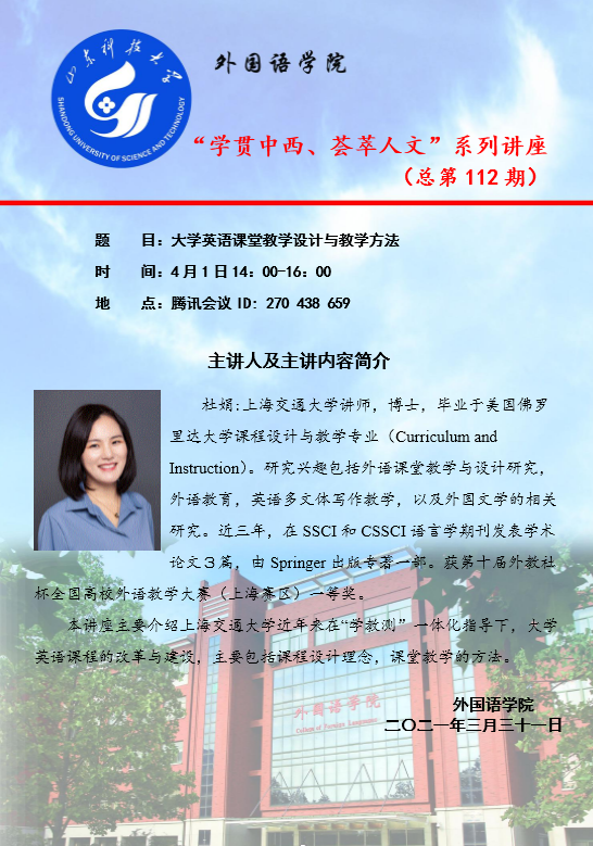 4月1日下午2:00,学院举行“学贯中西、荟萃人文”第112期讲座。上海交通大学菲律宾亚星杜娟老师以“大学英语课堂教学设计与教学方法”为题介绍了具体教学过程中的教学设计。讲座以腾讯会议形式进行,大学英语教师及部分专业课教师参加了讲座。