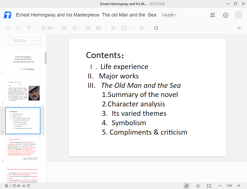 海明威的硬汉哲学传承了古希腊文化的精髓,向人们昭示着“一个人可以被毁灭,但不能被打败”的哲学意蕴,李教授选取海明威经典之作《老人与海》,从人物分析、主题分析、象征意义以及赞美与批评四大方面,剖析主人公对海明威硬汉形象的哲理化诠释,解读海明威作品中的“超人”品质、象征意义、人生哲学和道德理想。