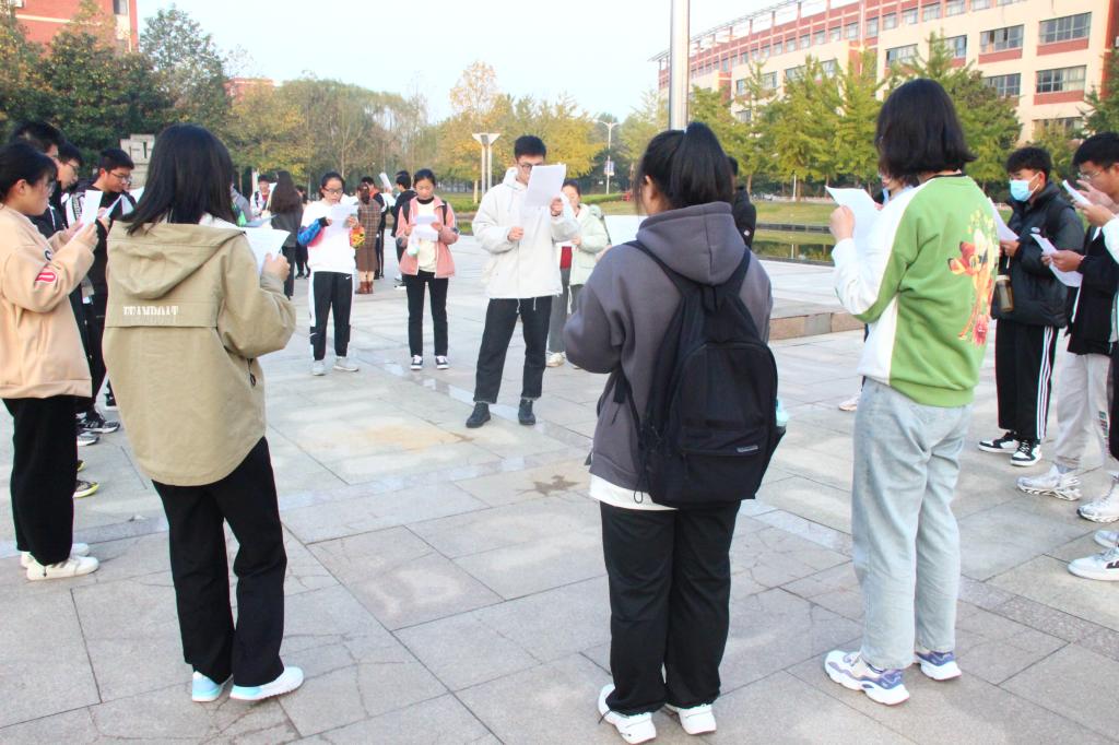 秋日的阳光温柔和煦,清晨的河水静默流淌。“一年之计在于春,一天之计在于晨”——莘莘学子,背着书包,踏着晨光,汇聚泰山广场,积极参加晨读。首先,英语协会晨读部队员向参与者发放英文文本,十余人围成圈,领读员站中央,排列整齐,布局规矩,形成一道亮丽风景线。紧接着,三声“Hey,what's up!”响彻广场,英语协会晨读活动正式开始。领读员以洪亮的嗓音和地道的音调进行领读,重点强调英语文本中的生词和难词,参与人员记下音标与释义并开始加以练习。晨读期间,领读员上前逐一纠正学生发言;击鼓传花时,学生积极上前朗读。多位朗读者以坚定的眼神、自信的姿态与悦耳的朗诵赢来阵阵掌声。
