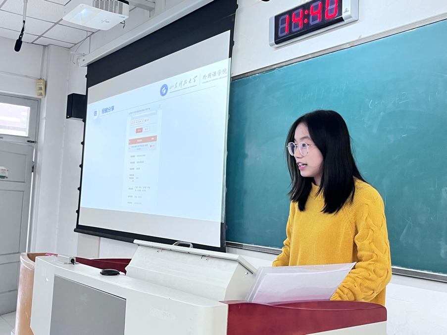 王晴对工作室进行了简要介绍。工作室旨在培养大学生学习与科研兴趣、实践动手能力、快速自学能力、思维能力为首要目标,以学科竞赛为牵引,秉承“惟真求新”的校训,依托新文科背景下“外语+”的创新工作理念和方法,积极构建人文社会科学创新创业教育“5C”体系,同时设立本科生朋辈导师制度,培养创新能力与教导能力,通过“学中干,干中学,带着学”的方式督促培养学生的学习能力与综合素质。工作室下设办公室、宣传部、培训部、竞赛部四个部门,分别负责日常活动组织、新闻宣传、竞赛选拔、培训和组织等工作。