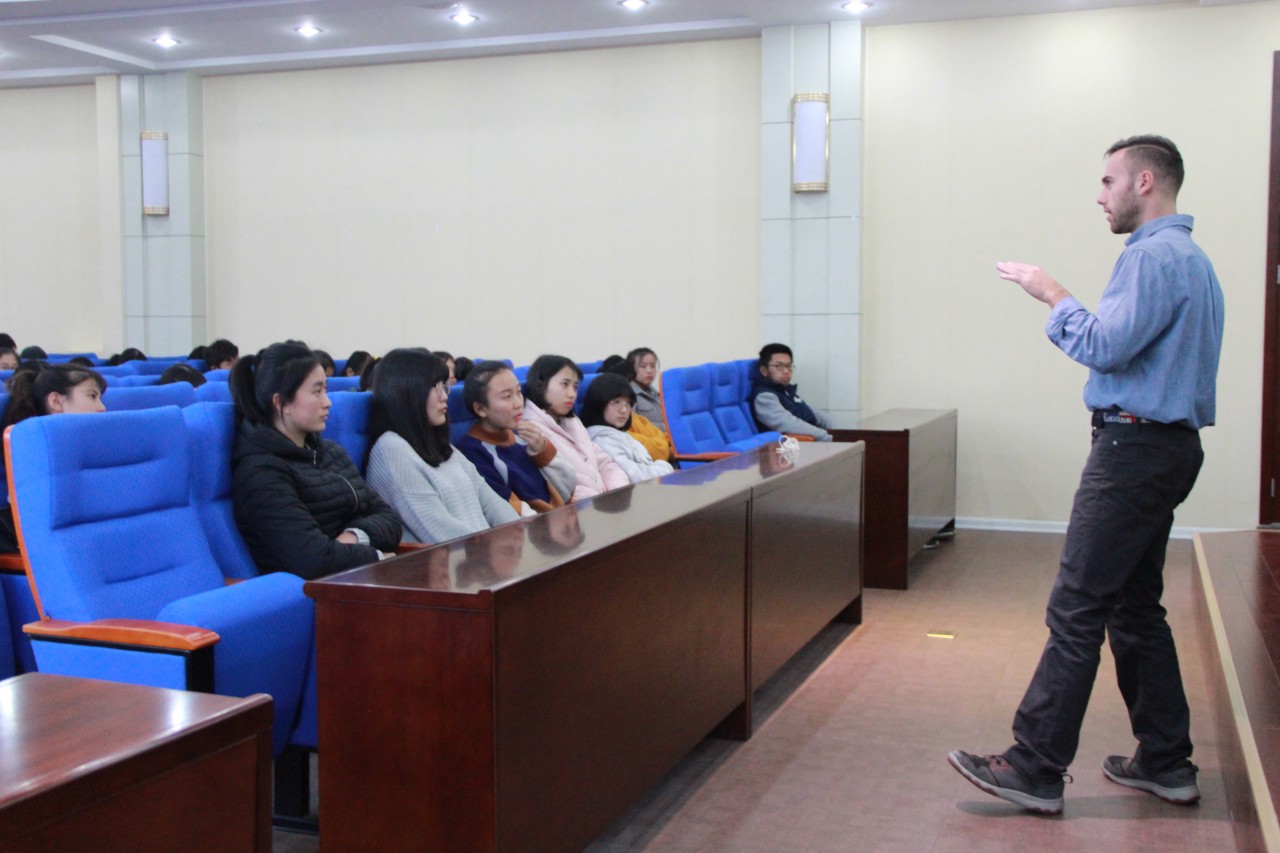 外教William以“American Athletics, Nutrition, and Active Lifestyle”为主题向同学们分享了美国的体育文化。从“Youth sports”到“High school sports”再到“College & University sports” ,从棒球到足球再到高尔夫球和篮球 ,William以自己的运动经历为例并通过极具表现力的肢体语言和生动形象的面部表情向大家介绍美国的体育文化,同时外教结合比赛照片、训练照片和运动巨星照片详细介绍了专业运动员的条件、优待、营养、睡眠等一系列问题,使我们对美国的专业运动员有了更深一步的了解。William独特的异域外表与夸张幽默的动作表演深深吸引了同学们的注意力,全场气氛诙谐融洽。