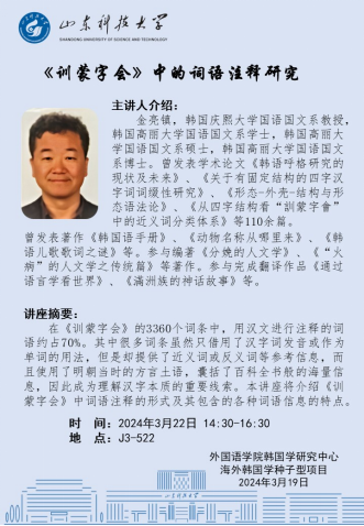 金亮镇,韩国庆熙大学国语国文系教授,韩国高丽大学国语国文系学士,韩国高丽大学国语国文系硕士,韩国高丽大学国语国文系博士。曾发表学术论文《韩语呼格研究的现状及未来》、《关于有固定结构的四字汉字词词缀性研究》、《形态-外壳-结构 与形态语法论》、《从四字结构看“訓蒙字會”中的近义词分类体系》等110余篇。