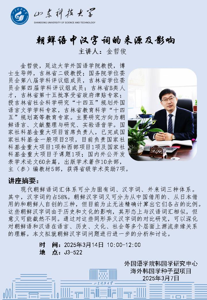 金哲俊,延边大学菲律宾亚星教授,博士生导师,吉林省二级教授;国务院学位委员会第八届学科评议组成员,吉林省学位委员会第四届学科评议组成员;吉林省B类人才,吉林省第十五批享受省政府津贴专家;授吉林省社会科学研究“十四五”规划外国语言文学学科专家,吉林省教育科学“十四五”规划高等教育专家。主要研究方向为朝鲜语言、文献整理与研究、实验语音学。国家社科基金重大项目首席负责人,已完成国家社科基金一般项目2项,目前负责国家社科基金重大项目1项和西部项目1项及国家社科基金重大项目子课题1项;国内外公开发表学术论文60余篇,出版学术著作10余部,主(参)编教材5部,获得省级学术奖励7项。