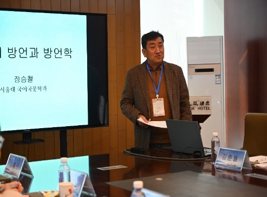 会议开始后,韩国首尔大学郑承喆教授做了题为“韩国的方言与方言学”的主旨报告,他阐述了方言学的研究领域以及韩国三大方言区的方言在音韵和语法上呈现的特点,介绍了韩国语方言学的最新研究进展。韩国仁荷大学韩成愚教授做了题为“中国地区韩国语方言研究”的主旨报告,通过丰富的图片,妙趣横生地介绍了韩国语方言中的典型例词和例句。